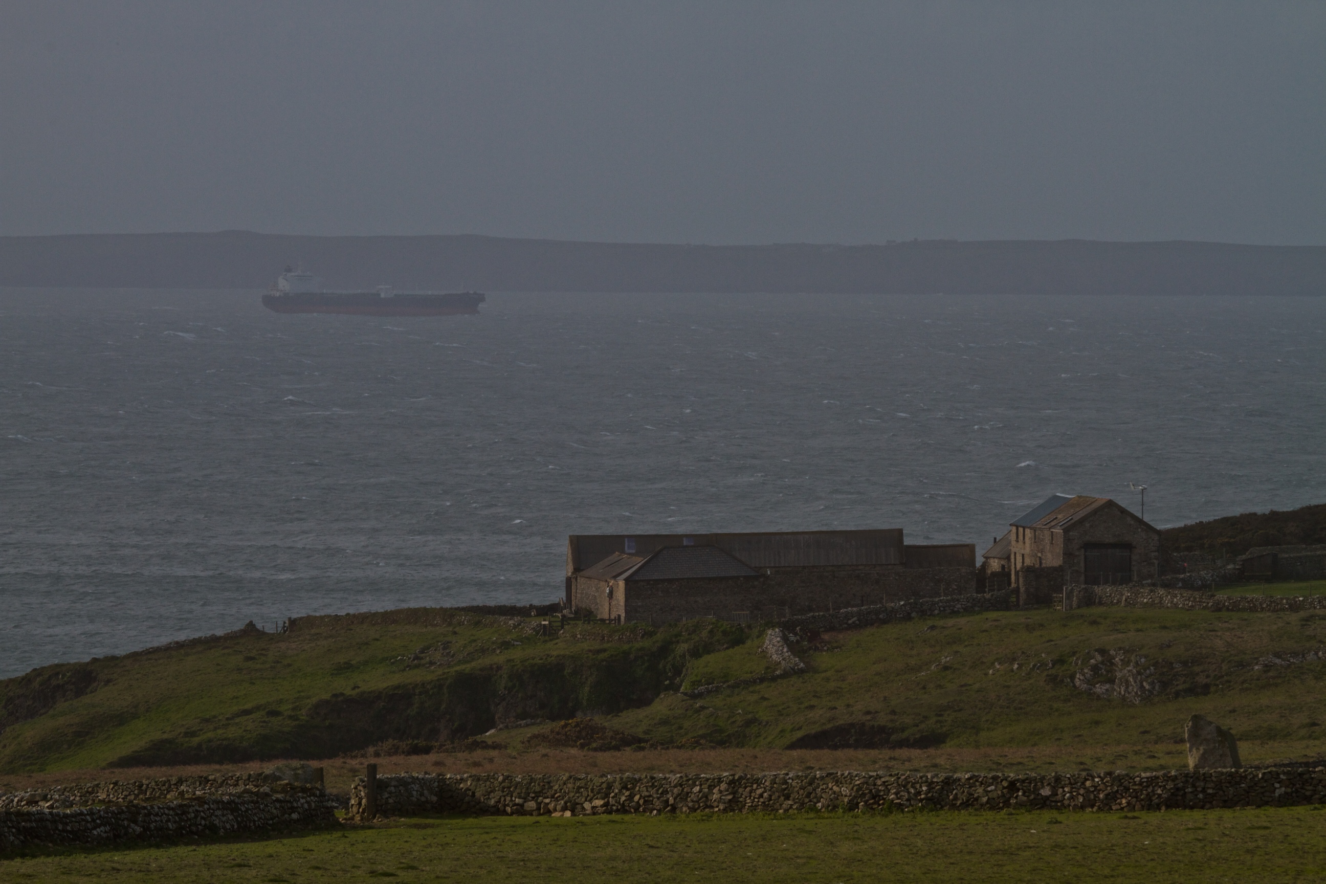 From Ramsey, ships can usually be seen lying at anchor in St. Brides Bay waiting to go into the ports. This morning there were four sat out in the bay including Arctic Breeze (pictured below above the Ramsey farm buildings), Bro Developer, Sten Skagen and Bro Deliverer.