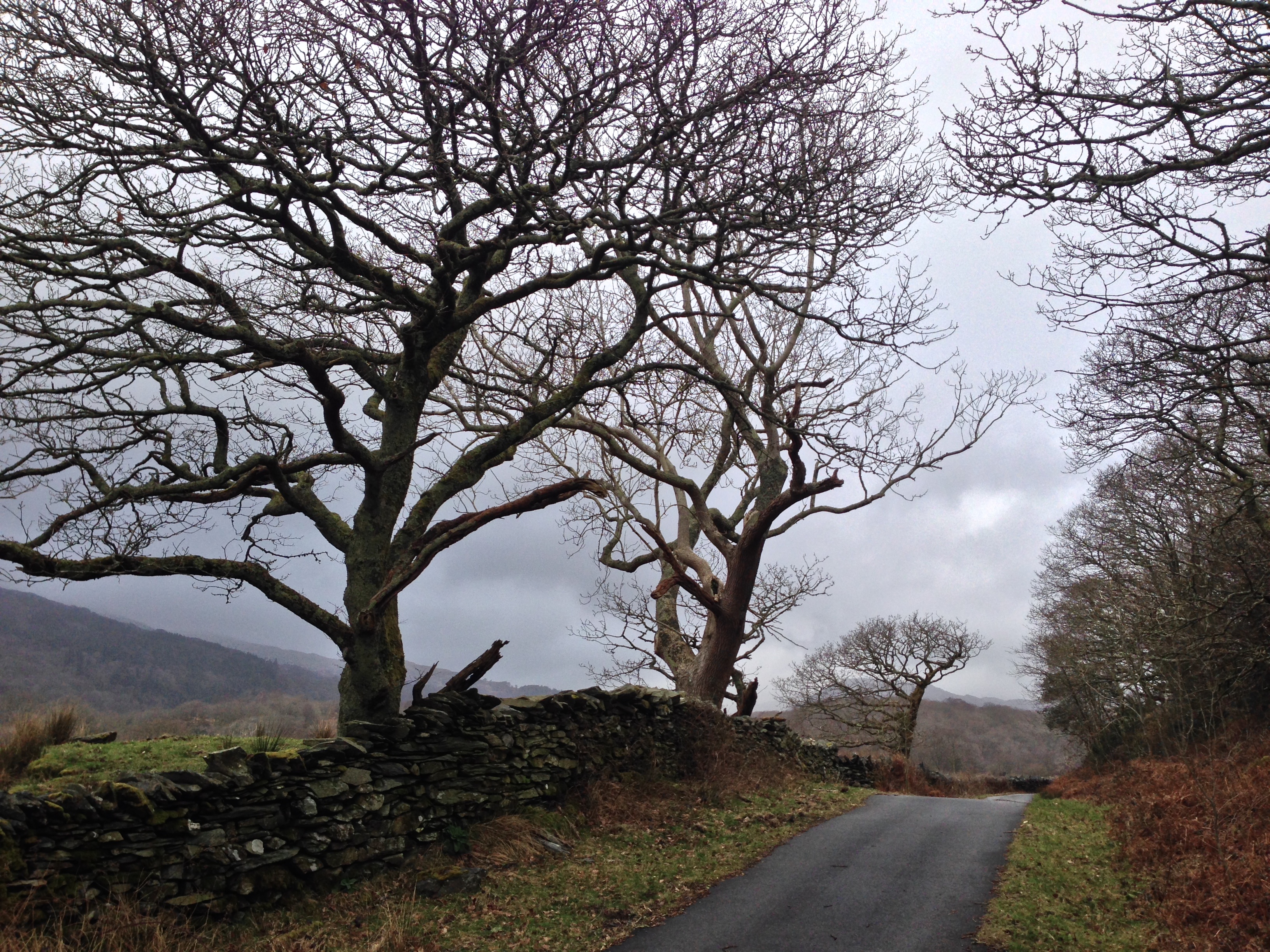 I approach a familiar junction and turn, slowing to make the car narrow enough to pass through the gateway. Onto the track I drive, passing between wall and slope to the valley bottom; there are no hints of spring here and the birds remain hushed by the lingering cold and damp. The signs of last autumn remain; leaves still cover the ground and the track is split by a line of fallen twigs and mulch. The bracken, once bright in its closing year rustiness, has withered further and is left almost colourless, like the surrounding landscape, subdued by the monochrome skies. The new season seems a long way off here and it is only the mosses coating the walls and trees that add any pigment to the otherwise washed-out scene.