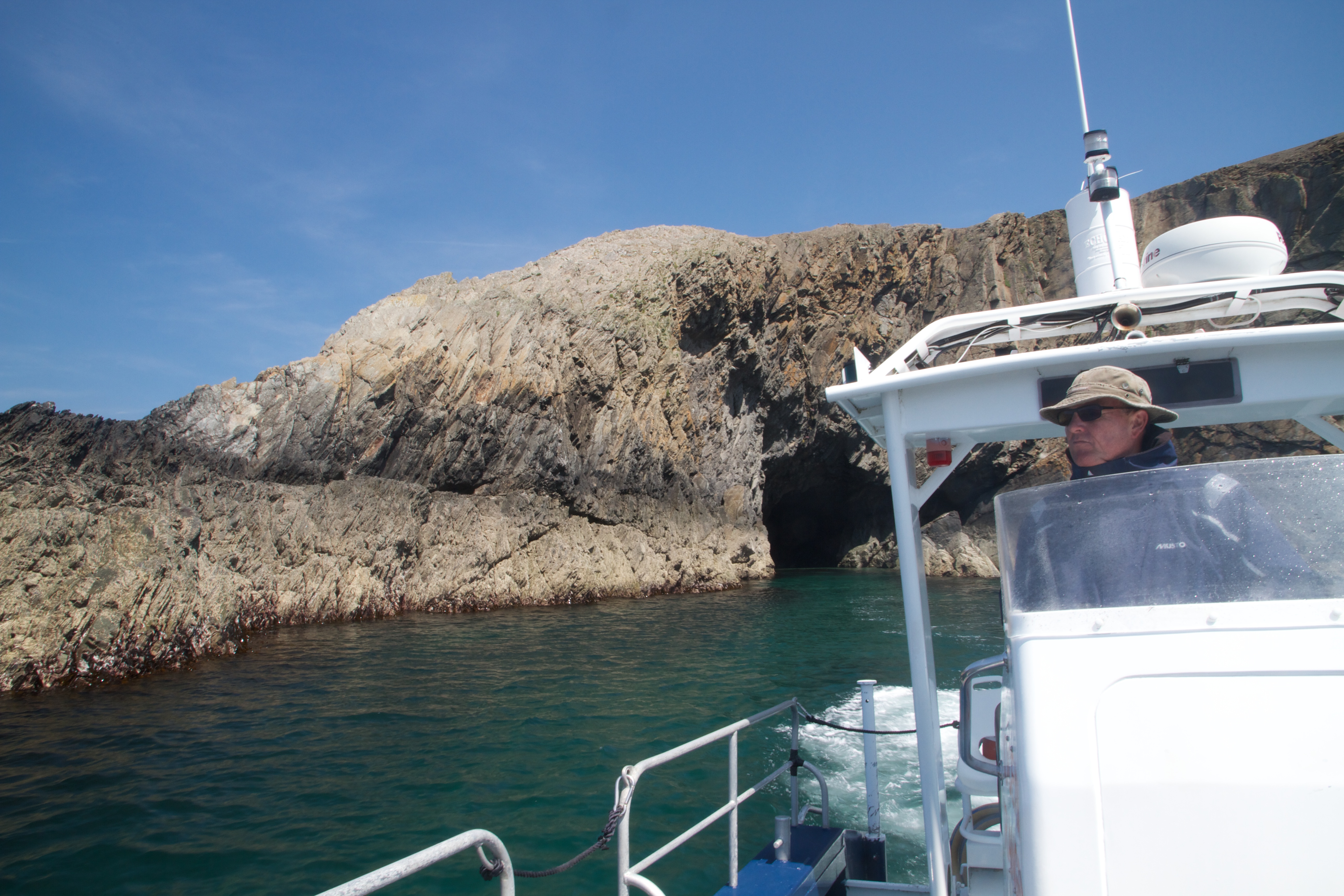 Every few years the seabirds are counted and most of the breeding cliffs can be seen and surveyed from the land. However, there are quite a few places hidden away from sight where the birds have to be counted from the water, so yesterday afternoon was spent out around the island looking up at the cliffs trying to spot razorbills, guillemots, fulmars and kittiwakes on their nests or breeding ledges.