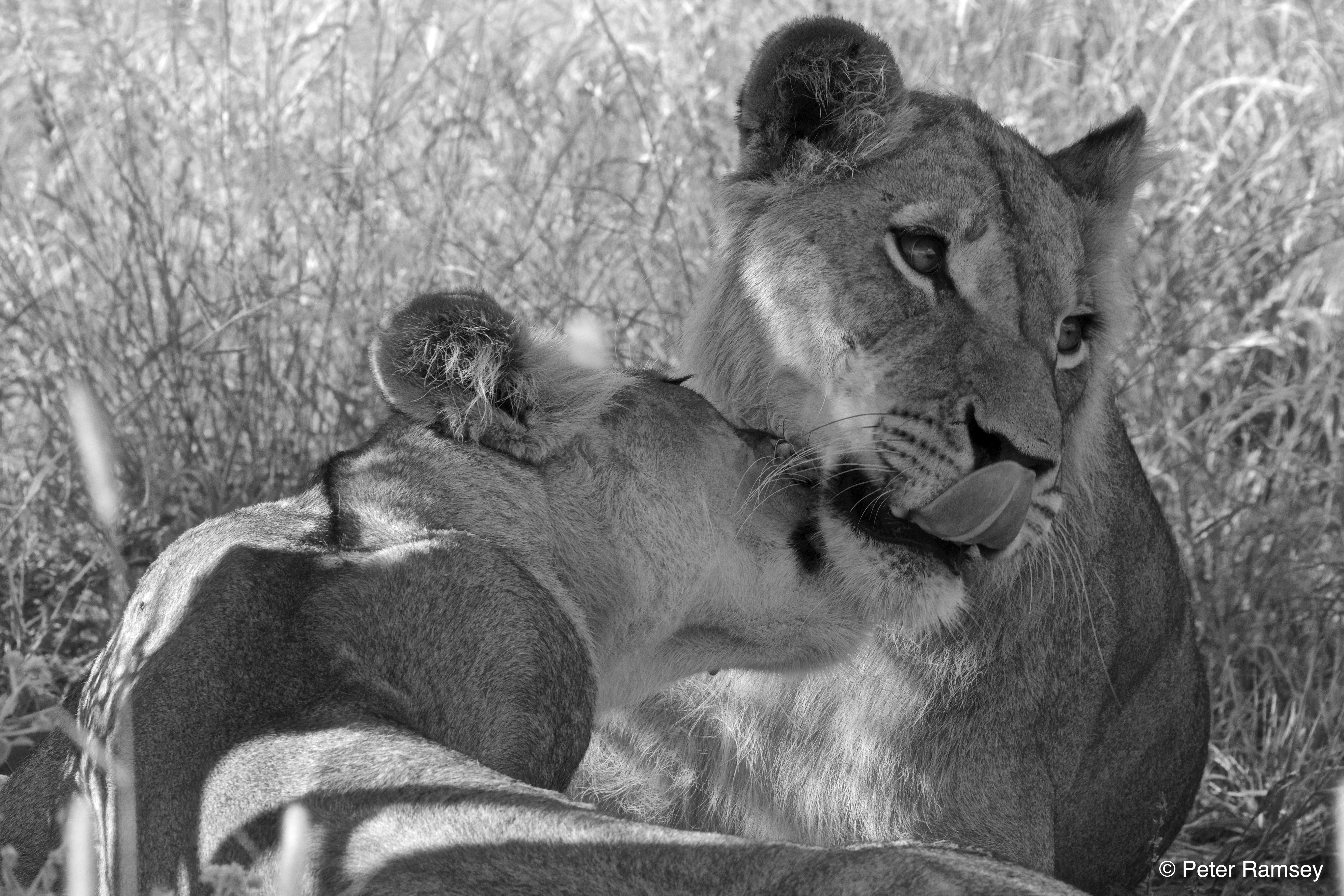 We had heard the previous day that a mating pair had been seen by others travelling in the area but had yet to come across them. We were soon given confirmation that this was the same pair with a robust mating completed with a snarling, bad-tempered finish. As the pair sloped off to the rest behind a bush, we had clearer views of two sub-adults wandering towards us and then resting in the long grass just a few metres from the truck. One was a young male, just starting to show the first signs of a mane, perhaps one day to be as magnificent and black as adult male’s; I silently named the youngster ‘bum fluff’, for it was a pretty poor effort of a mane to be honest.