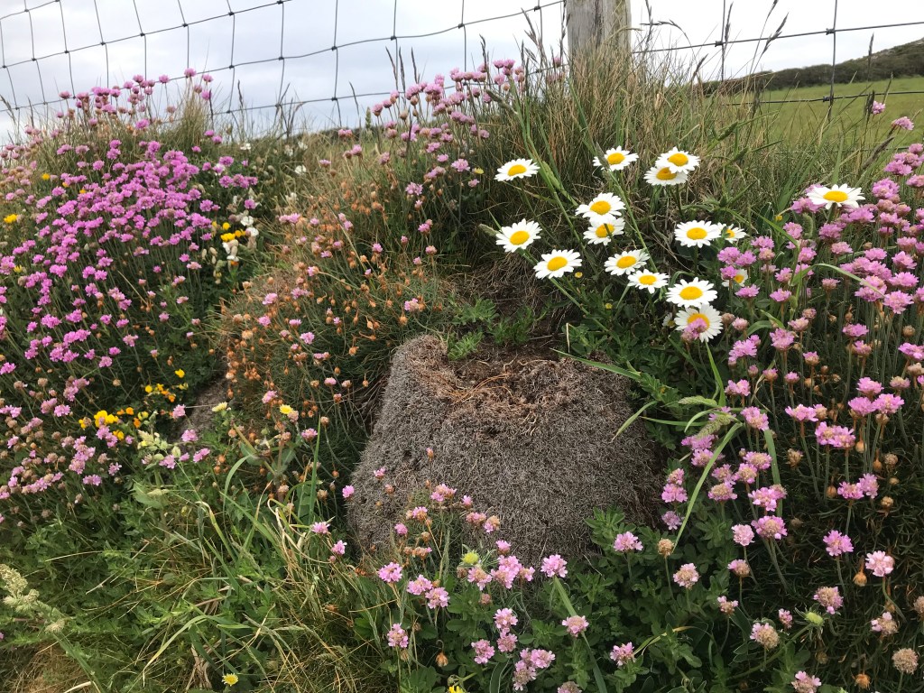 I spent my day off visiting locations further up the coast from St David’s and had walks to St David’s Head and Aber Mawr. I can see St David’s Head from my bedroom and it was great to get another angle from which to look at the island. Aber Mawr was a bit of a revelation; it has a lovely pebbley beach with a fabulous old woodland behind. The woods were full of bird song and wildflowers, and I don’t think I have ever seen so many big ferns growing in a British woodland setting. I also saw my first sand martins of the year and the beach has a colony on its sandy cliff. After the visit to Aber Mawr, I went up to Strumble Head to do a spot of sea watching. There were loads of gannets flying around the area with many making their dramatic dives into the sea. Breaching the surface constantly were groups of both porpoise and bottle-nosed dolphin. The three stops during the day were interspersed with drives down high-banked country lanes with wild flowers in numbers I haven’t seen any where else. All-in-all, I had a great day exploring the North Pembrokeshire coast.