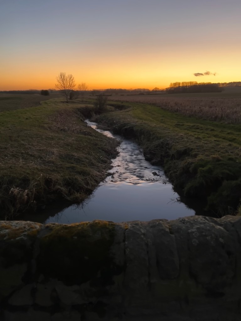 Nearly back at the car, we stopped to stand on the little bridge over which the dirt farm track crosses a stream, watching the orange glow of the sunset beneath the darkening blue above. This time it was a mistle thrush calling from a nearby stand of trees, heard clearly over the lightly babbling water. One of the usual local buzzards broke the spell momentarily but then a sudden dart appeared, racing towards us. A kingfisher flew beneath the arch of the bridge and away behind us into the darkness around the first meander.