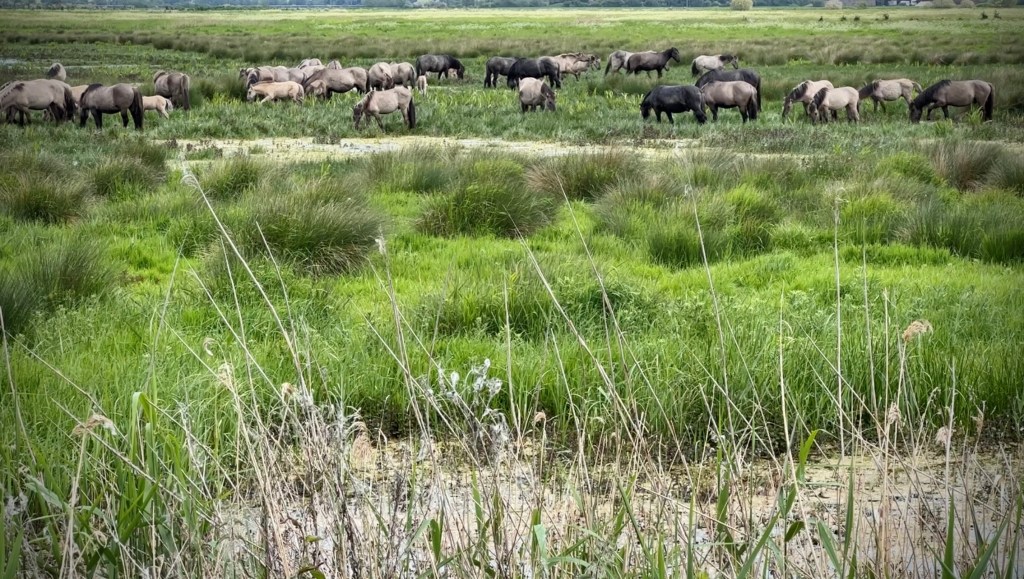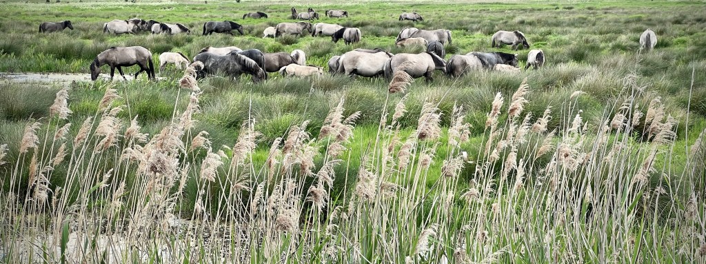 After that distant view of both the ponies and cattle, we didn’t expect to see them close up during our visit, despite going to the area closest to where they would be. As we headed back to the car, we had almost given up the hope but then we heard a commotion in the distance as we walked past the area we had previously looked. We suddenly saw a small herd of ponies coming into view across the meadows and shallow lakes. Rushing to get a better look, the view opened up to reveal a stream of ponies in different groups cantering across the landscape and getting closer and closer until they were right in front of us.