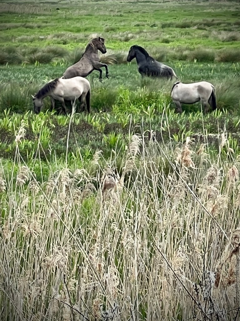It was immediately apparent that these weren’t just some tame hacking ponies from the local livery yard but very much their wild cousins. There was a dynamism in their lives you don’t see in horses grazing domestic fields. They weren’t just passively nibbling at the grass and lazily swishing their tails to swat flies. Instead, they were living real lives of herd animals. The mares we’re staying close to their youngsters, guiding them as they splashed through the water but with the older foals gaining confidence and rushing around in groups. The stallions were the stars of the show. Their strength and energy was obvious as they rushed around their harems, warding off the advances of others. Squabbles and fights would break out, with biting and kicking, and occasional face-to-face thrashing of limbs and hooves as they stood high on their rear legs. There was a constantly whinnying and snorting as the males tried to keep hold of their mares.