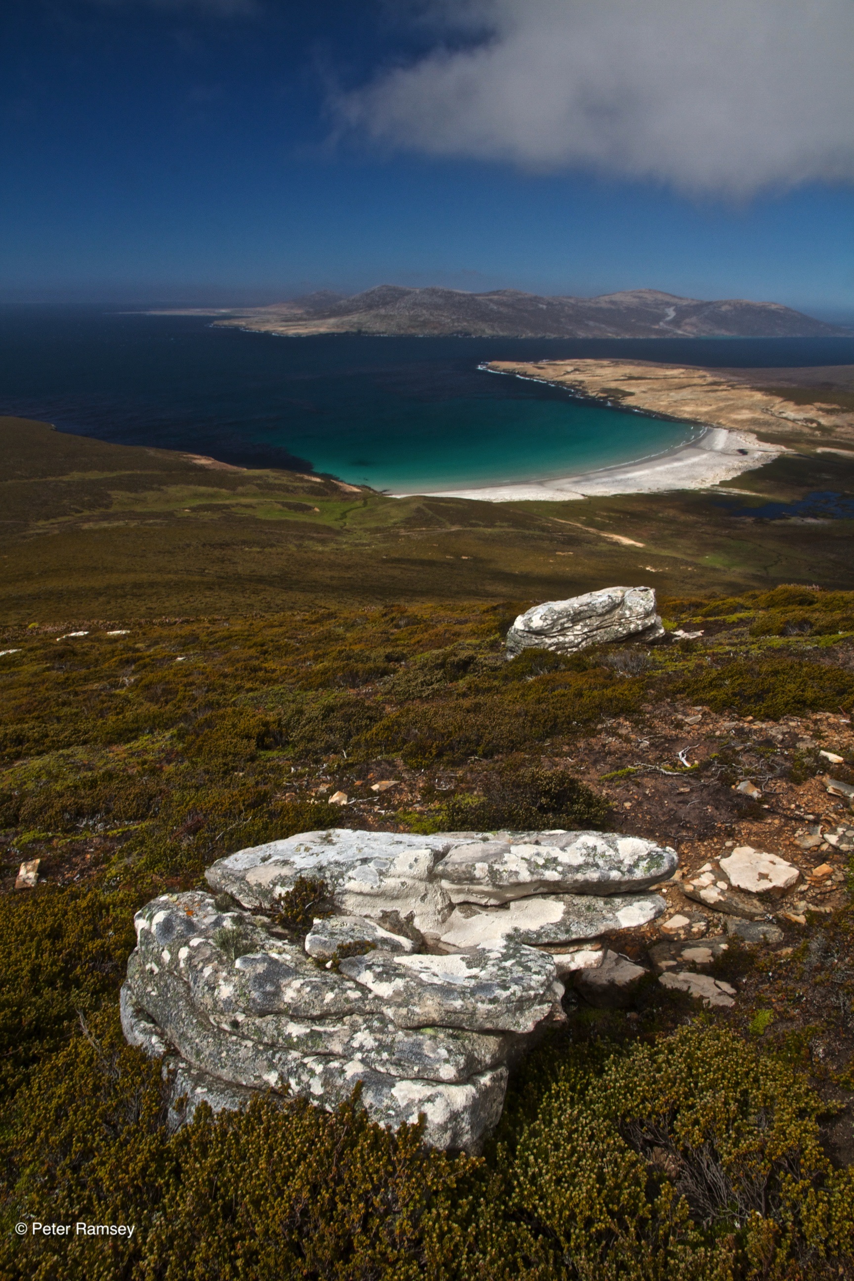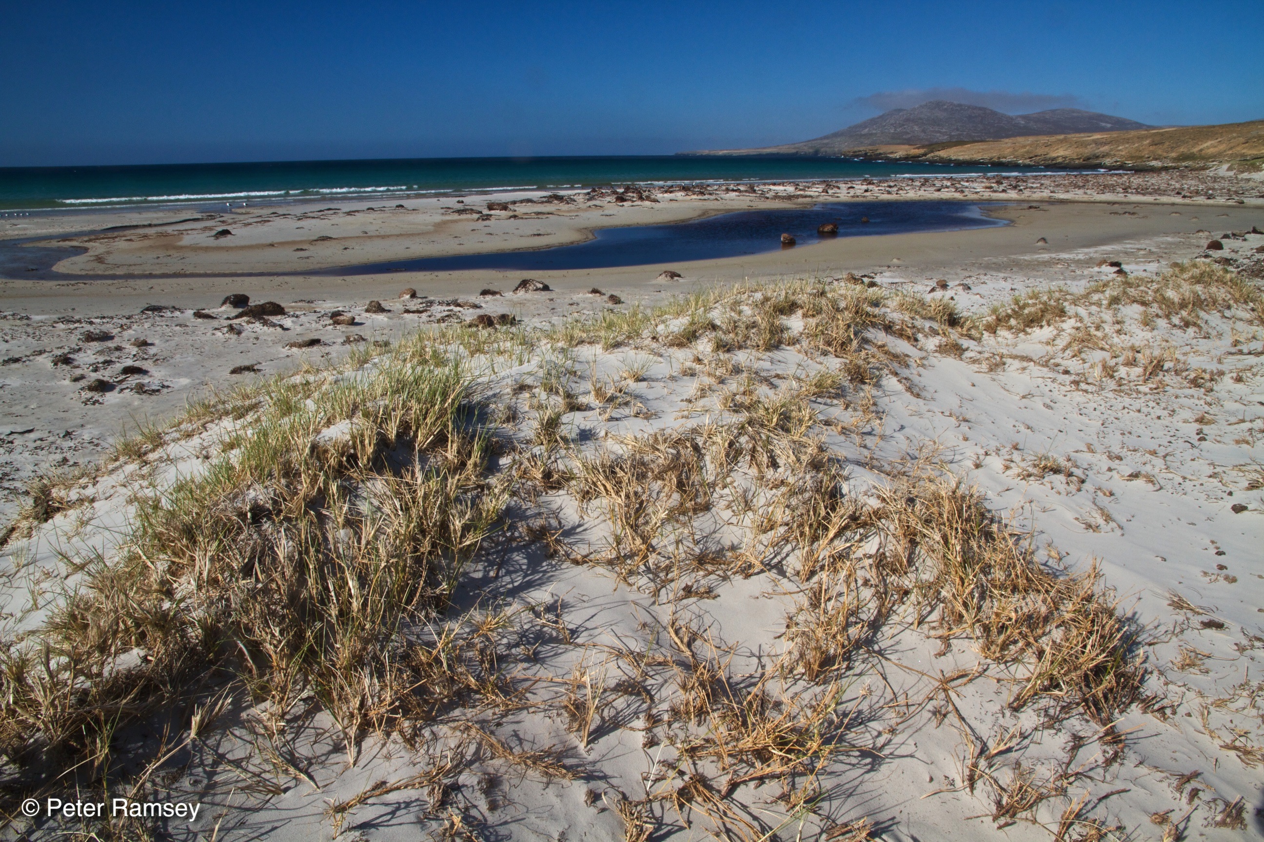 The beaches on Saunders are like many of those elsewhere in the Falklands – bright light-coloured sands washed over by turquoise waves. Standing on top of Rookery Mountain towards the beaches, with a stunningly deep blue sky overhead made for an equally stunning view.