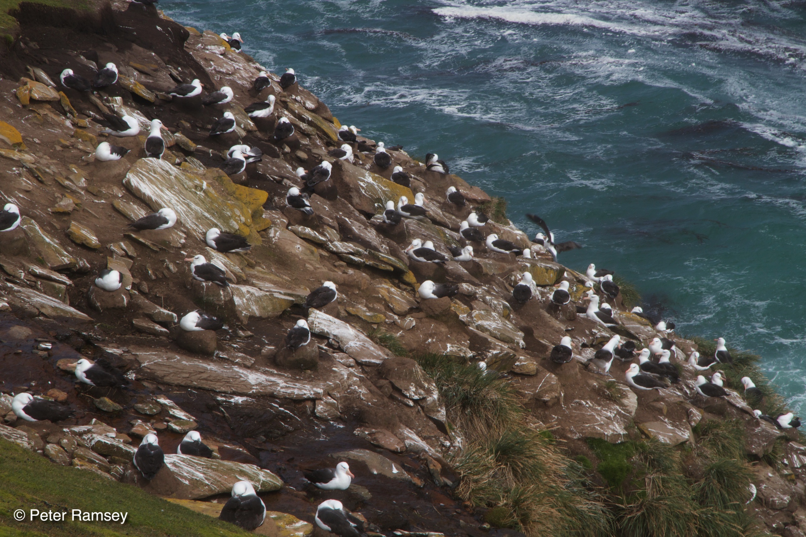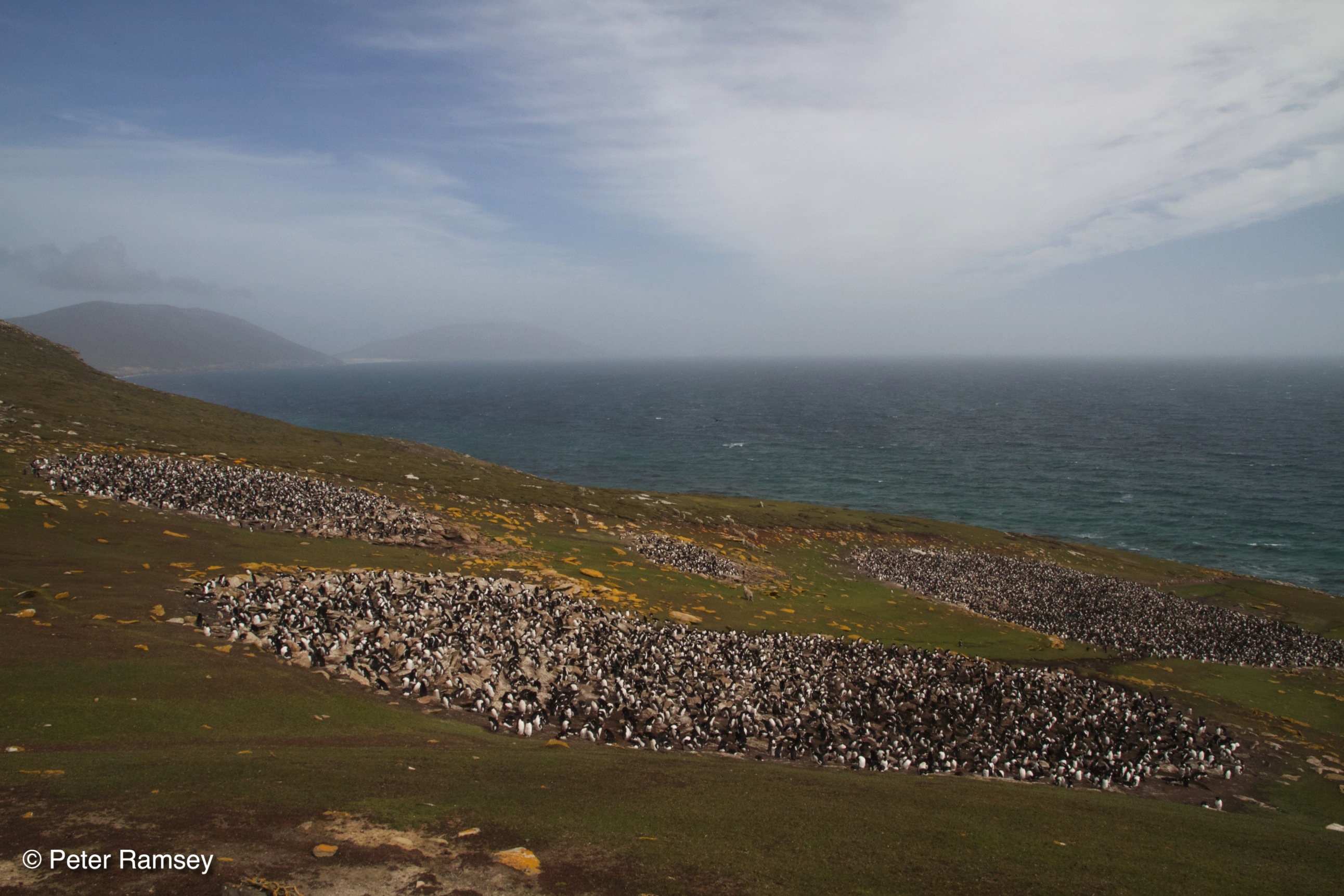 Further along the cliff top was the rockhopper rookery – I first found it during the first evening as night was starting to fall. After cresting rise after rise, I eventually started to hear and smell them, some distance before topping the final ridge and seeing the round colonies in an open cliff top valley. The penguins form several large breeding groups in the short-clipped grass above the tumbling cliff which these diminutive penguins bounce up and down. This was the location where the BBC filmed parts of its ‘Penguins – Spy in the Huddle’ series – this clip shows their troubles getting up the cliff!